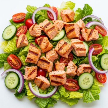Grilled Salmon, Romaine Lettuce, Grape Tomatoes, Cucumbers and Red Onions