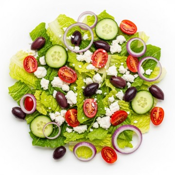 <p>Romaine lettuce, Feta Crumbles, Kalamata Olives, Grape Tomatoes, Cucumbers, and Red Onions</p>