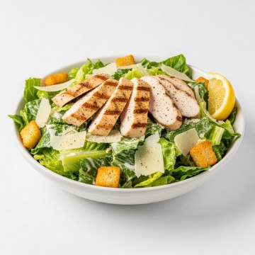 Freshly Grilled Chicken Breast, Romaine Lettuce, Croutons, Parmesan Cheese, caesar dressing.
